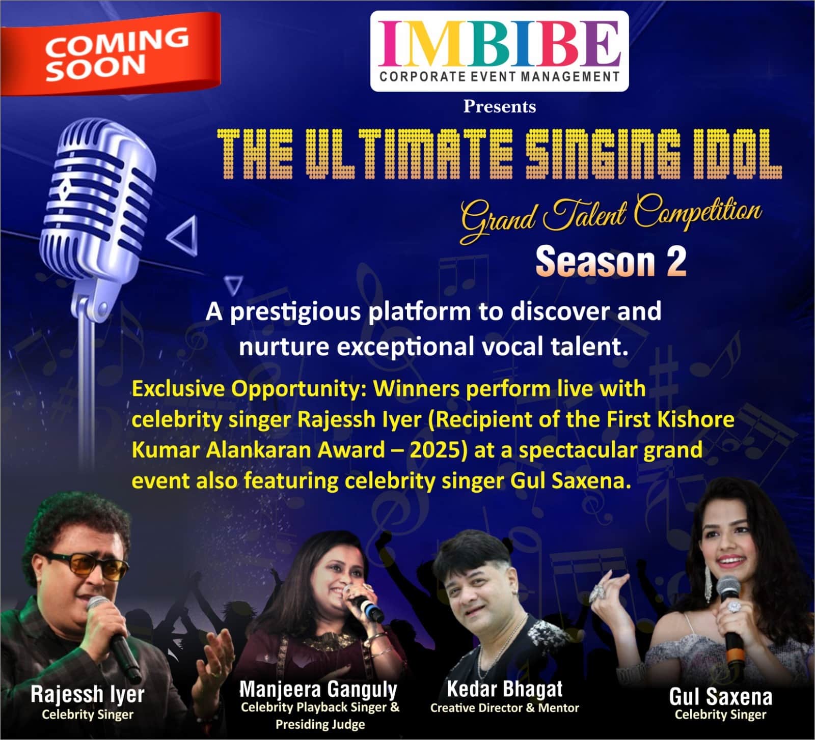 Imbibe Corporate Event Management proudly presents The Ultimate Singing Idol – Grand Talent Competition – Season 2 and provides an opportunity for new talents to perform on the big stage.
